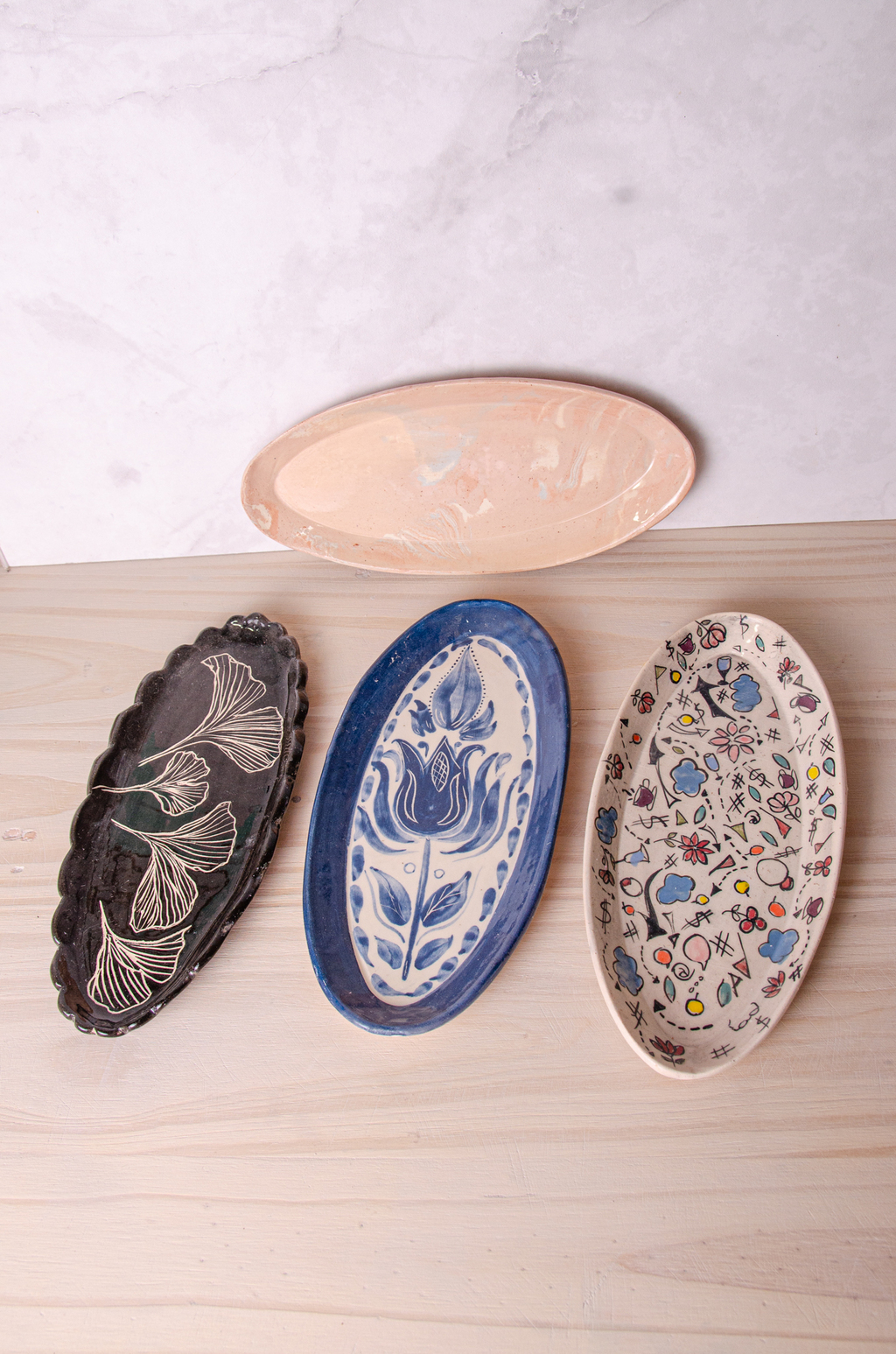 Bandeja de cerámica artesanal, decorada con técnica de esgrafiado y motivos de hojas de ginkgo. Diseño único, delicado y funcional.